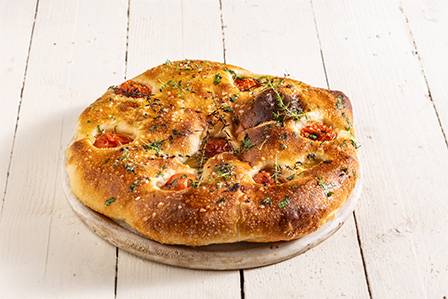 פוקצ'ה עגולה בליווי עגבניות שרי ושום קונפי